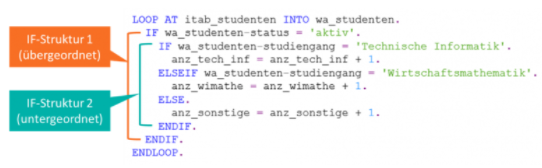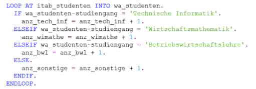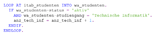 TRANSLATE SYNTAX IF SYNTAXExample: Within ITAB_STUDENTEN in our ABAP-Program different information about students, e.g. student course exists.ang. With help of a counting variable (GER „Zählvariable“) ANZ_TECH_INF (Data type i) we like to count the number of students with course „Informatik“.