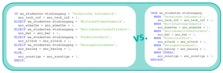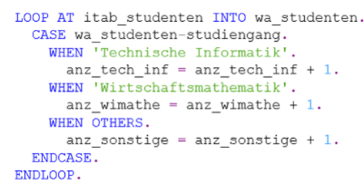 First step via LOOP-syntax all student data from ITAB_STUDENTEN will be read into work area wa_studenten. Second step via CASE-syntax the data field / technical name will be named which content should be checked (here field WA_STUDENTEN-STUDIENGANG). This is the single data object wihtin the CASE structure.