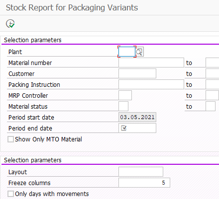 ZPP_stock_packaging : Stock Report / MD04 for Materials/ Packaging variants (GER Bestandsauswertung/ Dispoliste für Materialien/ Verpackungsvarianten)