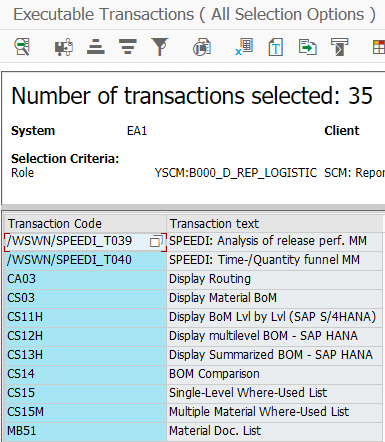 Display Transactions per Role –> SE16N –> Table AGR_1251 –> Object S_TCODE