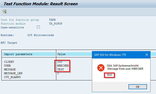 SE37 : Function Builder (GER Funktionsbausteine), e.g. execute Popup message to certain user: