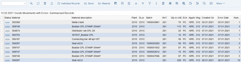 7. Material handling as well supply operation to Supply Area is done via SAP-EWM. EWM is the leading stock system which is not directly integrated in ERP. The synchrony of EWM and ERP stock must be monitored via SMQ2. Only the ok EWM movements which being transferred to ERP reduce the stock in ERP. Asynchronous stock lead to a wrong MRP and can cause run-out items.