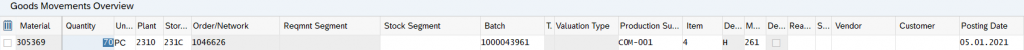 On 05.01.2021 the FAUF 1046626 wanted to backflush 70 pcs. of component 305369 with batch (GER Charge) 1000043961 on Supply Area (GER Produktionsversorgungsbereich PVB) C0M-001!
