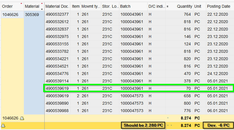 • Check documented movements. It is important that no storno (movement type 262 exists, otherwise calculate manually). The deviation is only 6 pcs and you can see that already the 70 psc have been backflushed. Therefore the a.m. COGI can be deleted. It seems the confirmation out out MES were sent twice: