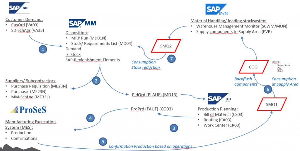 3. Production Planning is done in ERP-PP (Inhouse Production). Planned orders (PLAUF) being switched to Production Orders (FAUF). Basis are Bill of Material (BoM), Routing and Working Center.