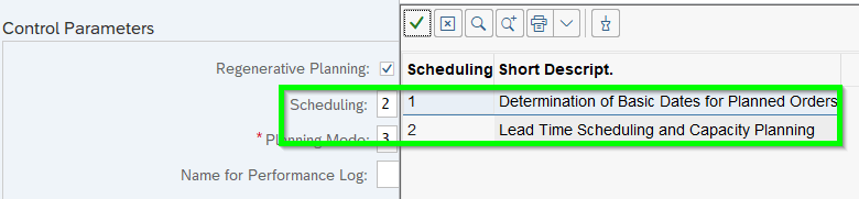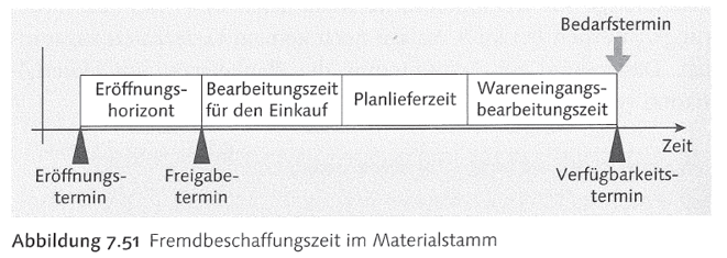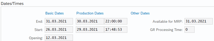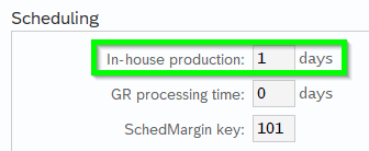 B. Basic Dates (GER Eckterminbestimmung für Planaufträge): The parameter „In-house production“ (GER Eigenfertigungszeit) from master data MRP2 being used: