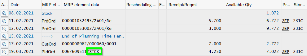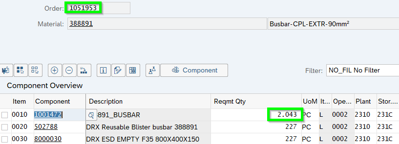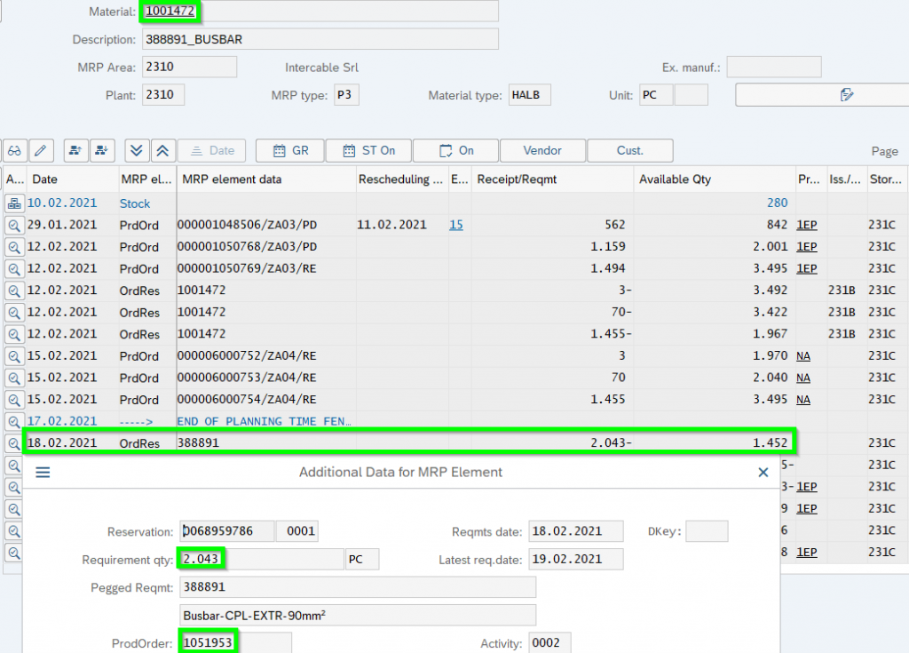 The ATP considers the current MD04 incl. SAP Elements. Let us check one component 1001472 where FAUF 1051953 needs 2.043 pcs. by 18.02.2021: