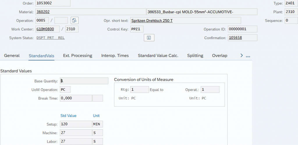 - Setup/ Machine/ Stripdown (GER Rüsten/ Bearbeitung/ Abrüsten) = Time based on values per operation, especially cycletime
