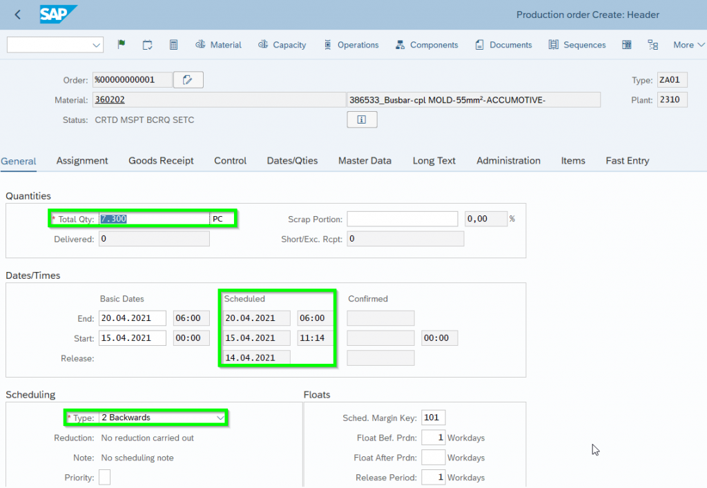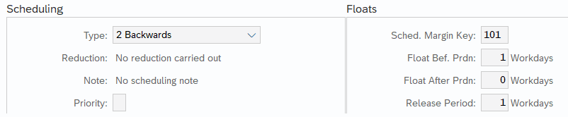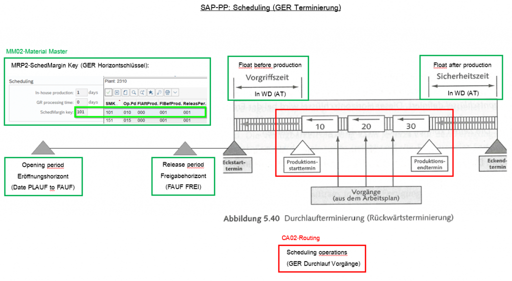 - Float before production (GER Vorgriffszeit) = Number of working days as buffer between Order Start Date (GER Eckstarttermin) and production start date (GER Produktionsstarttermin). This buffer helps if components not being delivered on time