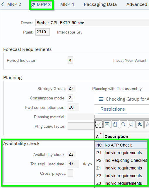 The Availability check is being set in Master Data-MRP3. In below’s example the total repl. lead time of 45 working days being considered with parameter Z2. Not only for ATP-Check of FAUF but also for customer orders this parameter being used: