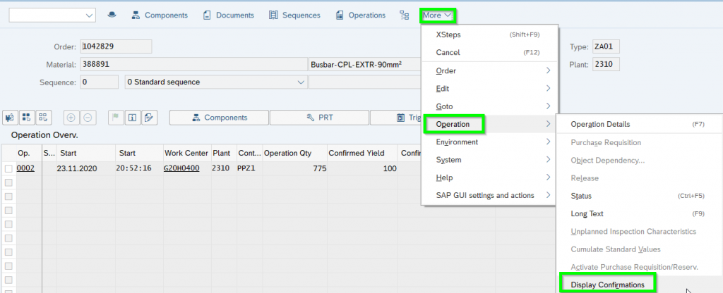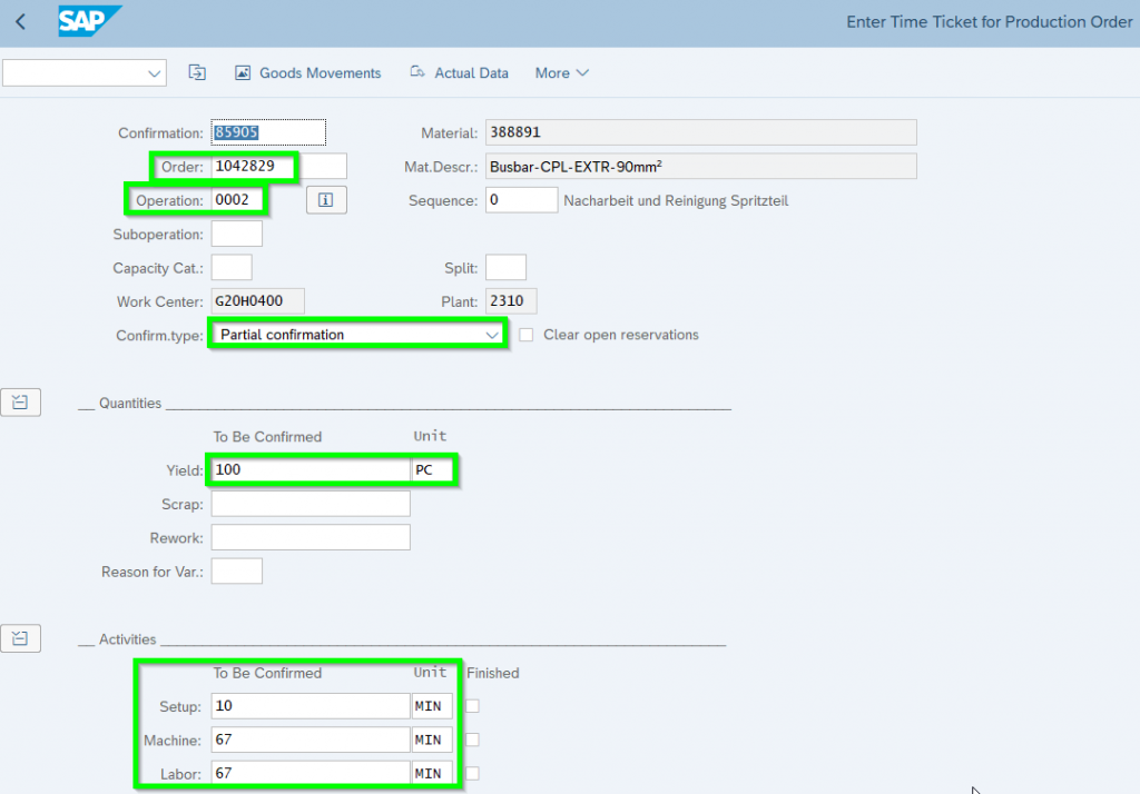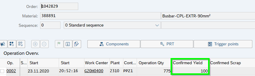 In a second step other operational steps being triggered (i.e. as-is costs; reduction of capacity, backflush). Normally such a confirmation being done via MES System. Here is an example for a manual confirmation via CO11N: