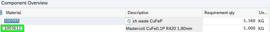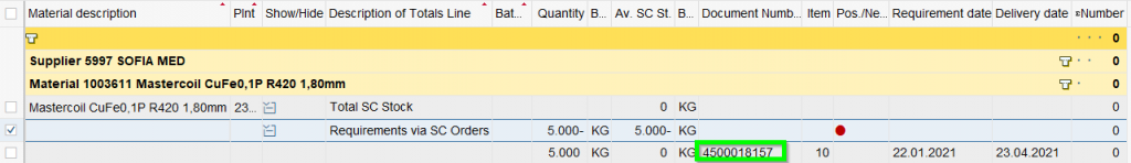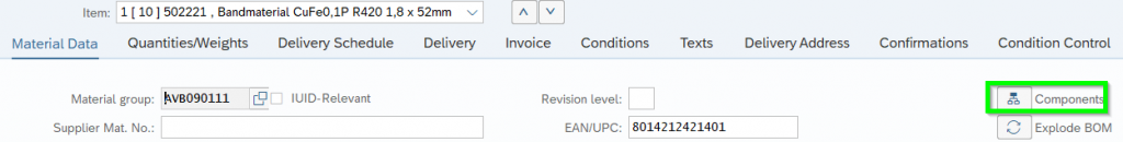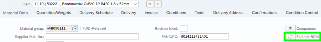 Hence the driver PO is 4500018157. Check the BoM which is loaded on the date of PO creation: